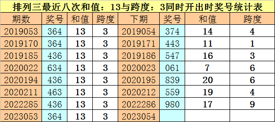 开奖归来:体彩摆设三第2023053期奖号为:364。和值为:13,跨度为:3。