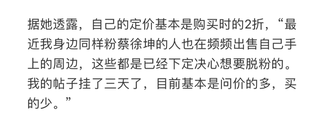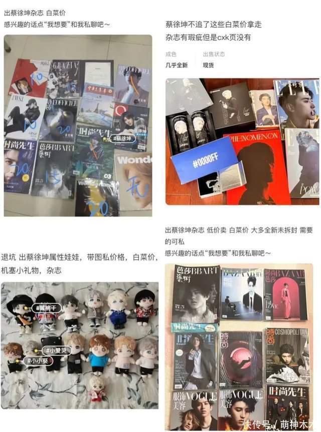 即即是也曾卖力声援的粉丝们,在目击蔡徐坤东说念主设坍弛之后,也颠倒默默地廉价甩卖蔡徐坤的附进物料,包括杂志和玩偶,还超过标注以“白菜价”出售。据某位粉丝浮现,她身边的其他粉丝也在积极出售蔡徐坤的附进,但出售着力并不睬念念,基本上很少有东说念主感深嗜。