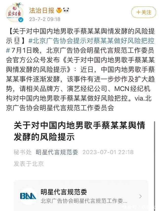 再加上各大蓝V接连点名发声,央视网、财经网、中国新闻周刊、法治日报、环球时报、等多家媒体发布还转发了谈论蔡徐坤的风险请示,这也让这位昔日顶流难以重回往日景色,在内娱圈是要绝对凉透了。